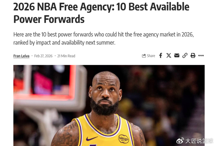 在常规赛进入冲刺阶段,强弱球队明显分化之际,美媒《fadeawayworld》提前评选出26年自由市场值得关注的TOP10前锋,其中火箭伊森第7名,41岁詹姆斯仍排第一。